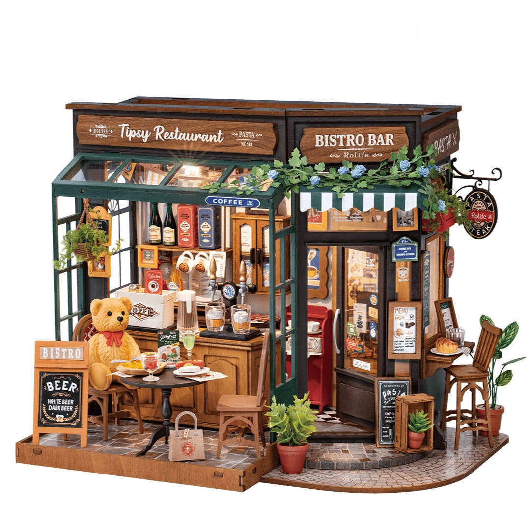 🍷 Envie de recréer l’ambiance d’un bistrot chaleureux sous les lumières de la ville ? Le Bistrot de Minuit vous propose une scène miniature inspirée d’un bistrot français romantique : bar, mobilier d’extérieur, armoire à vin, affiches, enseignes et déco soignée... tout y est. Son éclairage LED met en valeur les moindres détails une fois la nuit tombée.