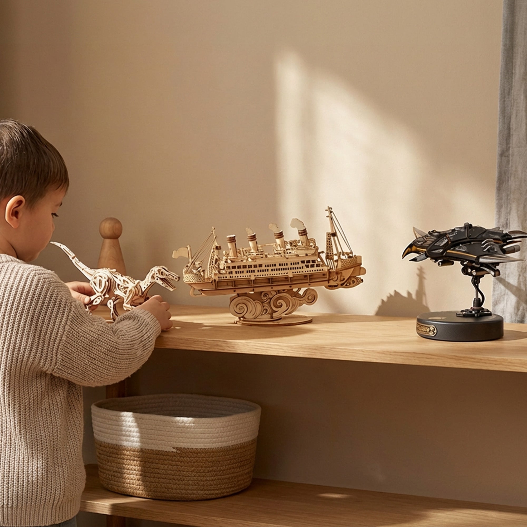 Nos maquettes pour enfants et débutants privilégient le bois plutôt que le plastique, dans une démarche écoresponsable. Pensées pour durer, elles sont conçues pour être montées, manipulées et conservées avec soin. Cet univers transmet des valeurs de patience, respect du matériau et plaisir du fait-main.