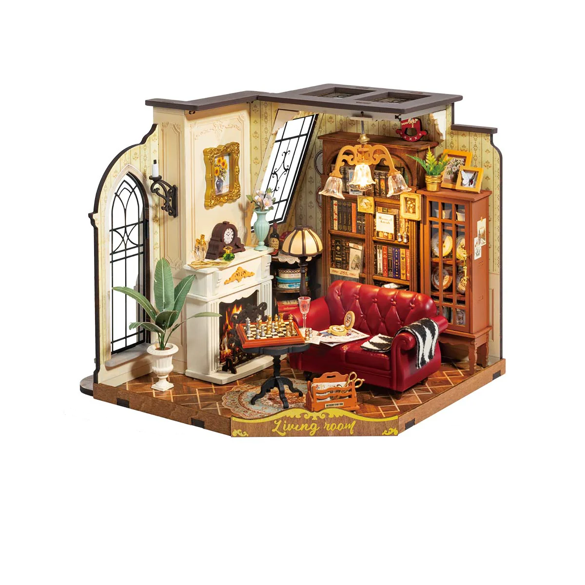 Les 284 pièces en bois s’emboîtent avec précision pour former un salon miniature réaliste. Le montage dure environ 5 heures, sans colle, avec un système LED intégré fonctionnant à piles.